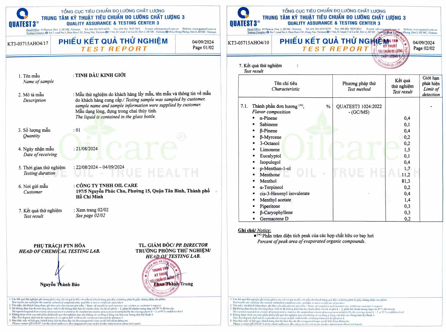 Xem bảng kiểm nghiệm thành phần của tinh dầu kinh giới do QUATEST 3 (Trung tâm Kỹ thuật Tiêu chuẩn Đo lường Chất lượng 3)