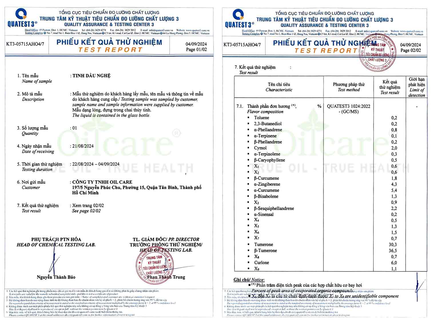 Bảng Kiểm Nghiệm Chất Lượng Tinh Dầu Nghệ – QUATEST 3